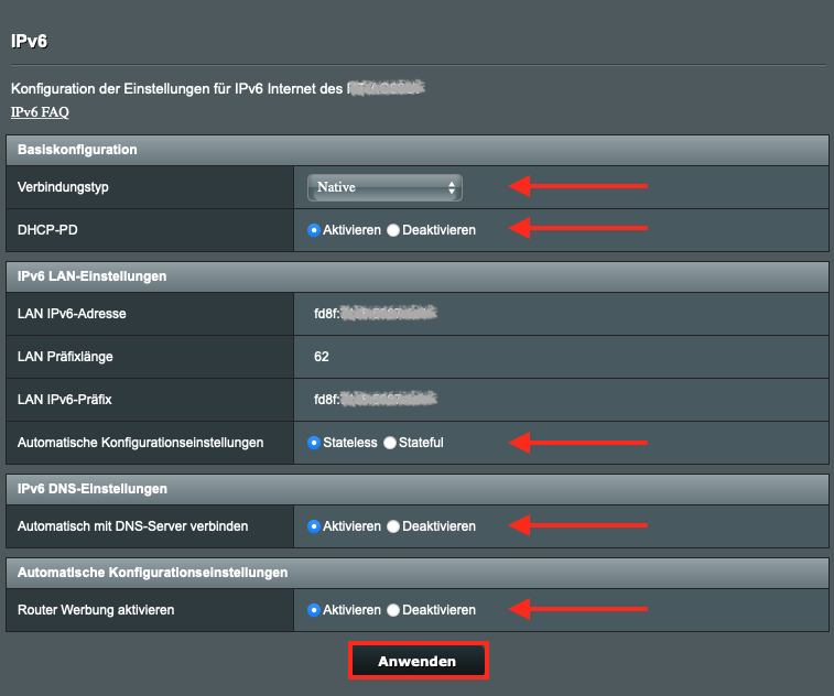 Damit der Router eine IPv6 Adresse erhält und ein IPv6-Subnetz zugewiesen bekommt, sollten die Einstellungen unter IPv6 wie im Screenshot zu sehen sein.