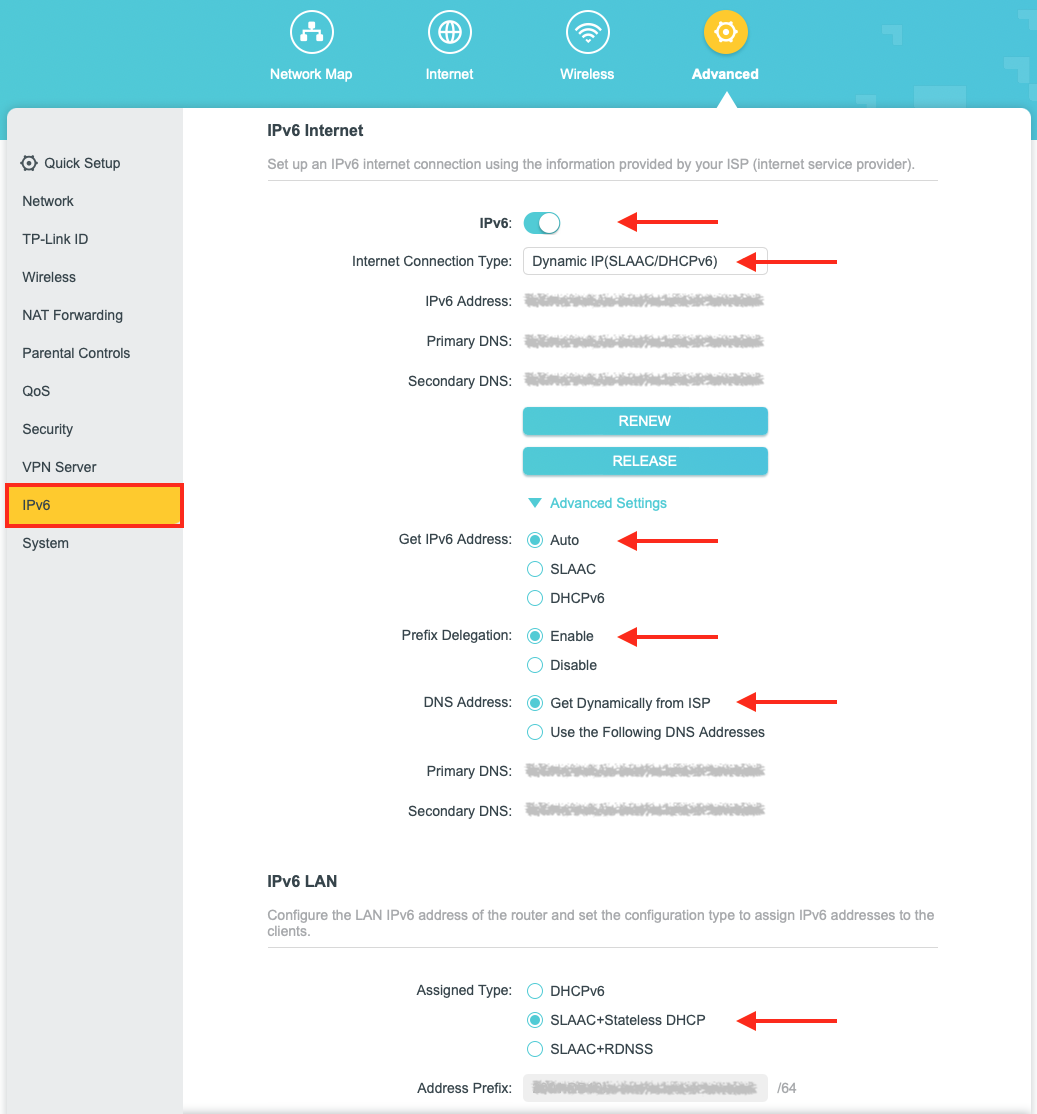 - die Einstellungen unter IPv6 Internet und IPv6 LAN wie im Screenshot zu sehen anpassen